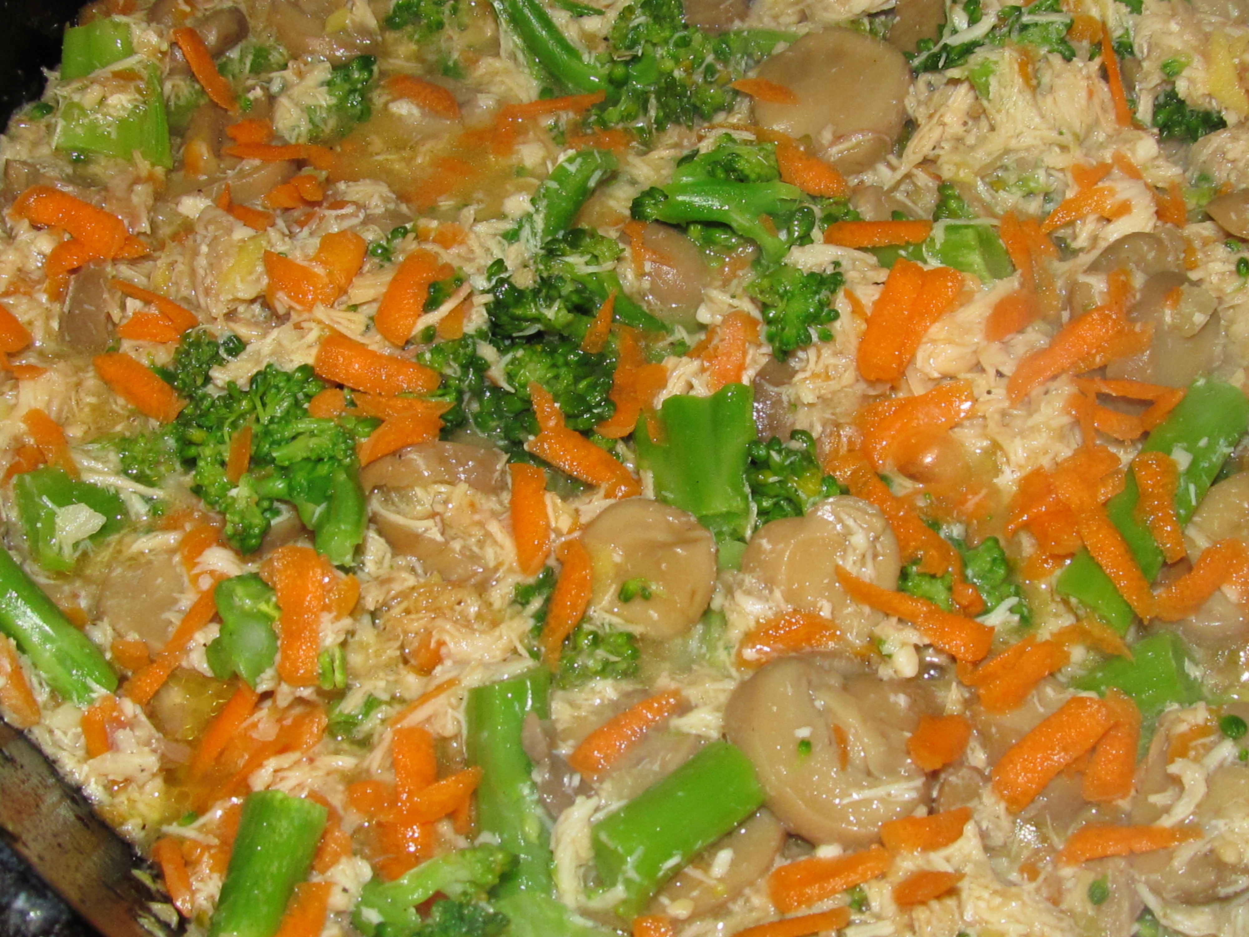 In large skillet, add ginger and garlic to heated oil. Stir letting spices cook until ginger starts to brown, about 1 to 1 ½ minutes on medium high heat. Turn heat down slightly to medium, adding carrots, pork and cream of chicken soup, continuing to stir. When cream of chicken soup is thawed and liquid, and carrots are tender. Add broccoli, mushrooms with juice, and soy sauce. Let all ingredients start to bubble. When all ingredients are heated through it is done. Serve warm over rice. I like brown rice for this recipe.