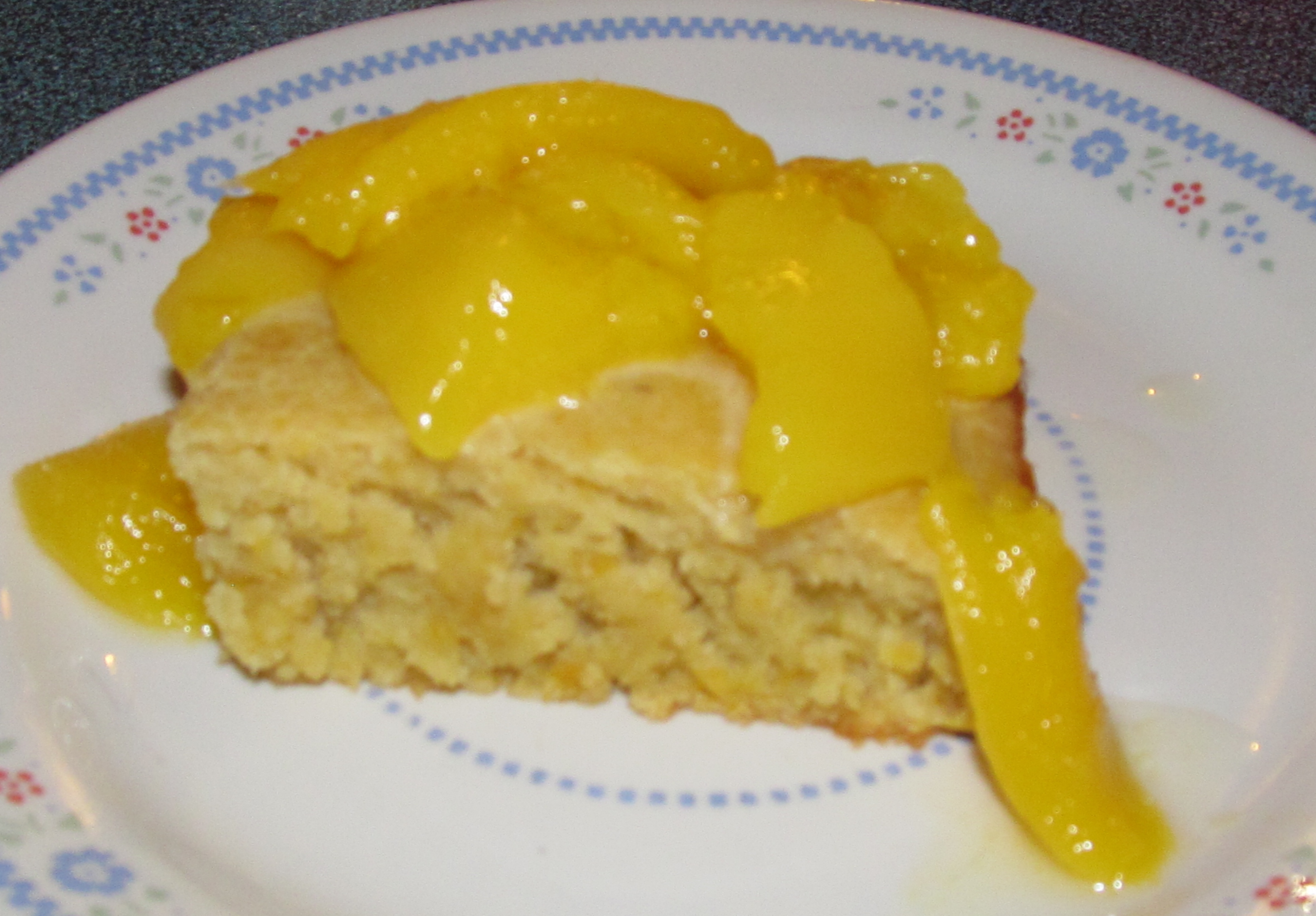 In food processor chop peaches into chunks, add eggs, butter and lemon juice and blend again, just to beat the eggs. In separate bowl whisk together flour, xanthan gum, salt, baking soda, baking powder, sugar and sweetener. Pour flour mixture into food processor and pour hot water over flour. Gently pulse blender until flour is incorporated. Process only until all ingredients are blended. You can let this batter set for a while if you want, but with the peaches added it is moist and not very grainy if you go ahead and bake it. Pour batter into 9×13 inch, greased and GF floured baking pan. (for cakes I would rather use additive free powdered sugar, to flour cake pans). Bake 30- 35 minutes or until cake is done and browned around the edges.