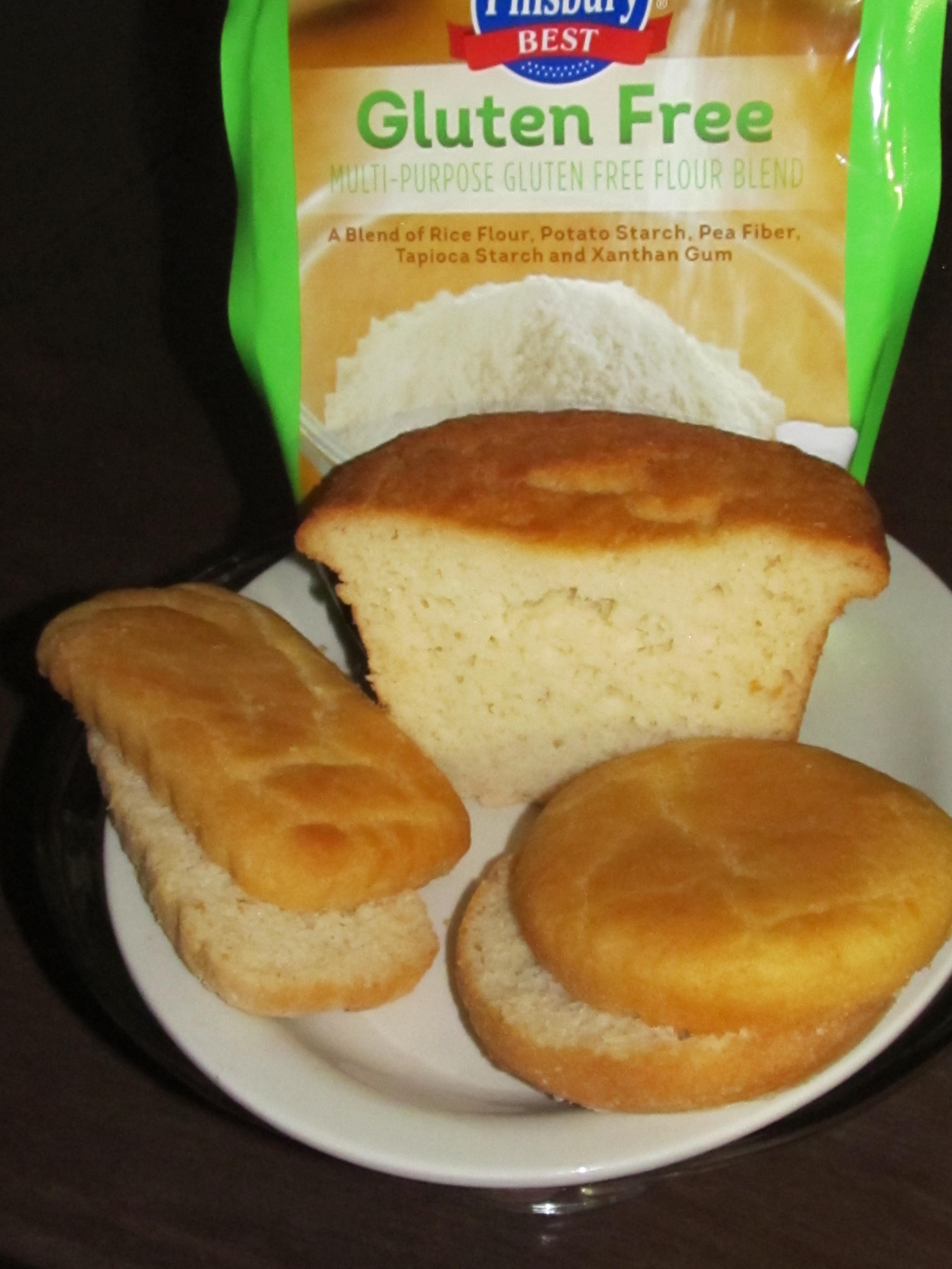 I received my order of Bob’s Red Mill 1 to 1 Gluten Free Flour. So far I’ve made just one loaf of bread, using my favorite brown bread recipe. The Bob’s Red Mill, loaf is on the right. The one on the left, I made with Tom Sawyer GF and Betty Crocker GF Flours mixed 1/2 and 1/2 as I usually do. Both were made with the same amount of flour, and leavening. The same process, everything. The texture is fine, it’s not crumbling, but it did not rise, and it does have that dreaded hole in the center, it’s just lacking something. It did not exchange 1 to 1 in this recipe. I will keep working on it, and when I get it down I’ll post the winning recipe!