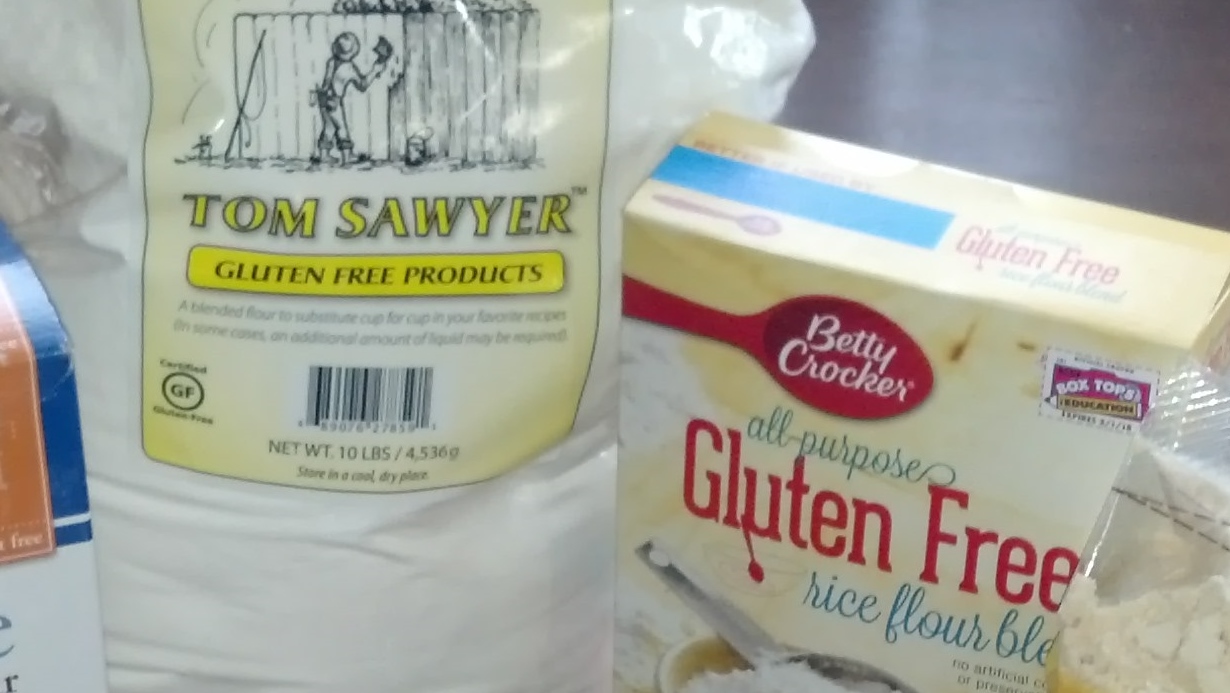 I had a conversation with a lady yesterday, that is still having trouble finding the right Gluten Free flours to work with. So I thought I would add some more info. about the flours I use. My favorite G F flours and the ones that react and taste more like the wheat flour that we all grew up with, are the Tom Sawyer Gluten Free Flour and Betty Crocker Rice Flour blend mixed. Below is the recipe I use to mix these 2 flours, and where to find them.