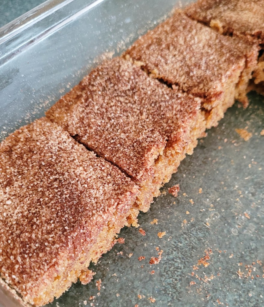 Whisk eggs, oil, and brown sugar together until well blended. Add GF Flour, cinnamon, and baking powder. Blend until smooth. Pour into oiled 9×9 inch glass baking pan. Spread Batter to edges of pan, ( let set for 10 to 15 minutes) and bake at 350* for 23-25 minutes or until set in the center. Remove from oven spread melted Butter on top, then sprinkle with sugar and Cinnamon.