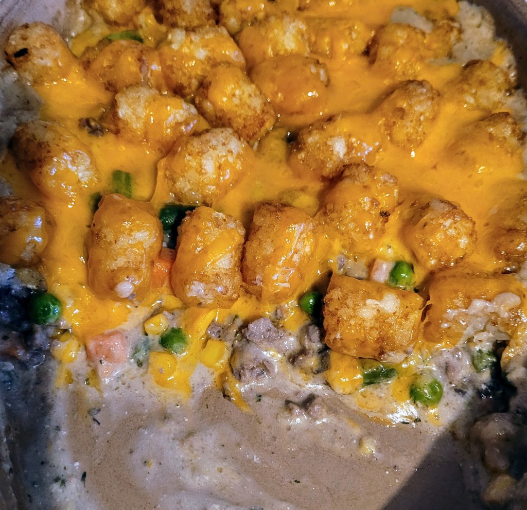 Brown ground beef in medium skillet, add season salt and Worchester sauce. Stirring in vegetables, and cream of mushroom soup. You can either leave it in the skillet or pour this mixture into a greased 9 X 11 inch baking dish. Top with ½ cup of the grated cheese, then add Frozen tator tots, completely covering top of mixture. Place casserole into oven and bake for 30 minutes. Remove from oven when tots are crispy, top with remaining cheese and serve.