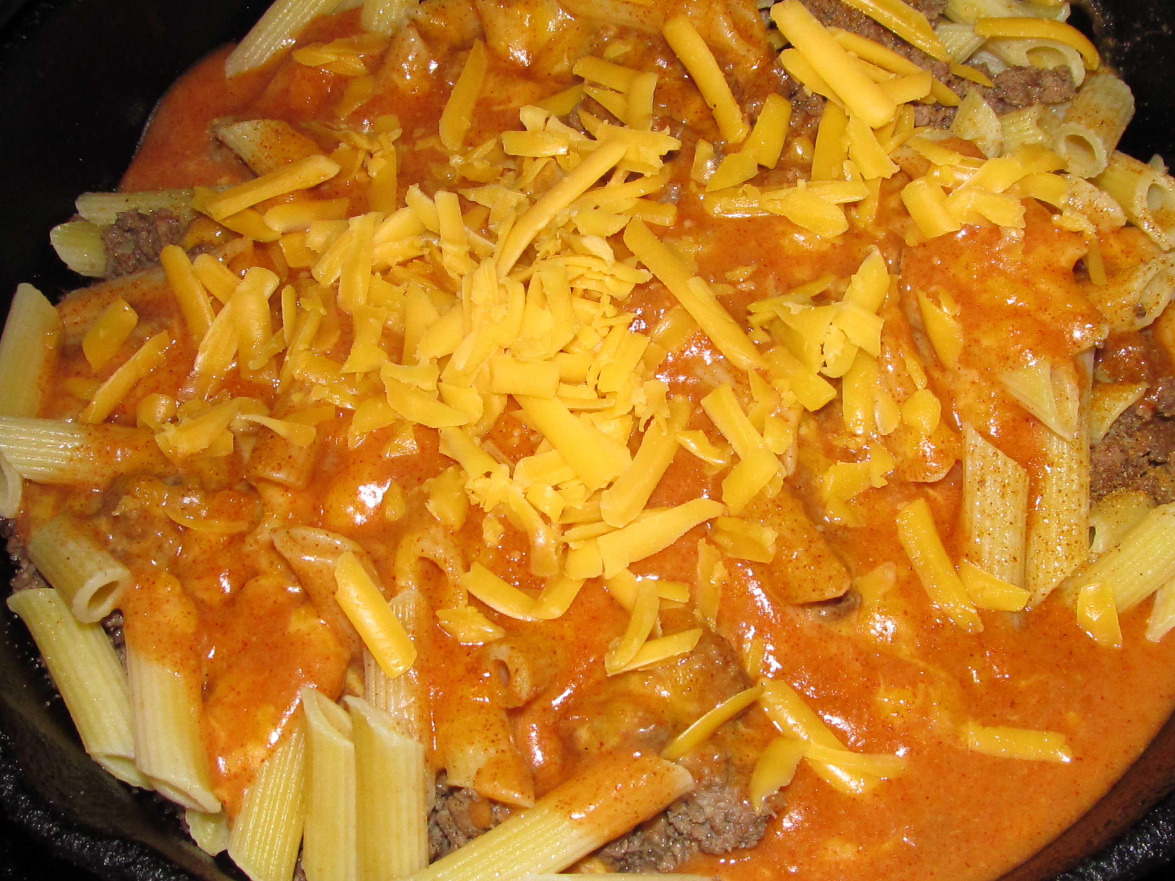 Before I start cooking my meat, I start the water for the pasta and add 1 Tablespoon of butter or oil. When it comes to a boil I pour in my pasta and stir, so that it doesn’t stick together. Cook accourding to package directions, less one minute or the shorter of the2 times it gives. The Heartland pasta I used calls for 12- 14 minutes, I cooked it 12 minutes. I start the timer when I add the pasta to the boiling water. When time is up remove pan from heat and drain water from pasta. I then Rinse the pasta in cold water and drain again. Let it set until ready to add to meat.
