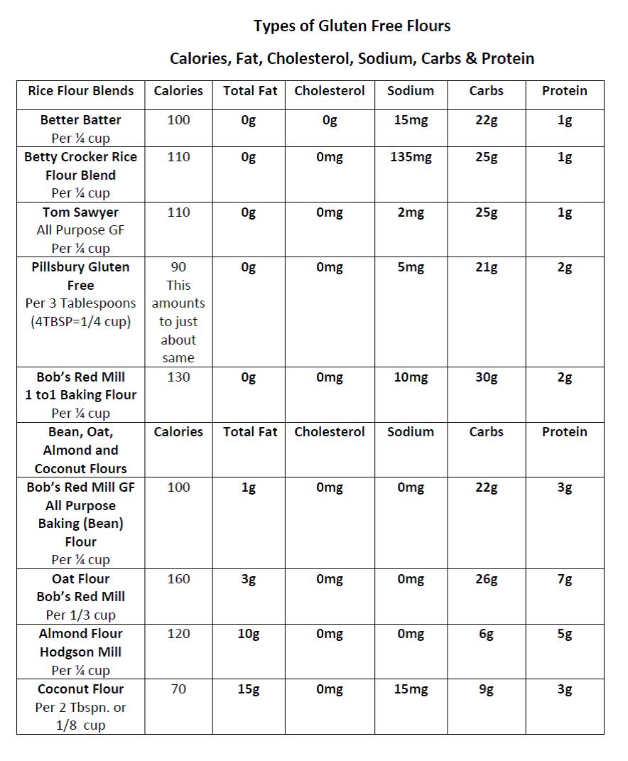 Gluten Free Flours and Nutrition I’ve had several questions lately about the nutritional values of Gluten Free flours. So here are few of the ones I’ve used. Please take note that not all of the serving sizes are the same from one type to another. So it can be misleading.